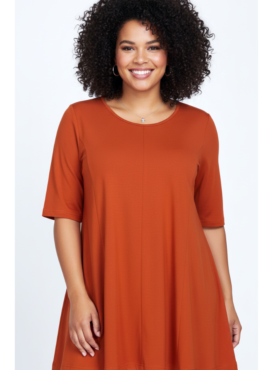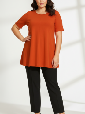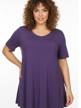 - De A-lijn snit zorgt voor een vloeiende, ontspannen pasvorm die langzaam uitloopt van de schouders naar de onderkant. Dit maakt het shirt ideaal voor grotere maten, omdat het de taille accentueert en de heupen en buik mooi camoufleert zonder strak te zitten.