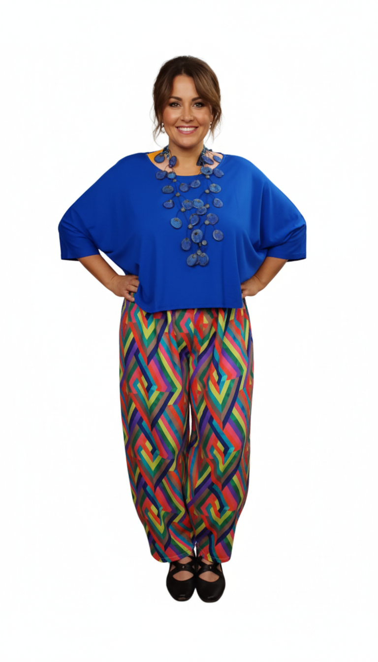 Door de vele kleuren in de broek past deze mooi met de vele shirts van Zazou, o.a A-line shirts, shirt Mery, kort of lang met korte mouw.