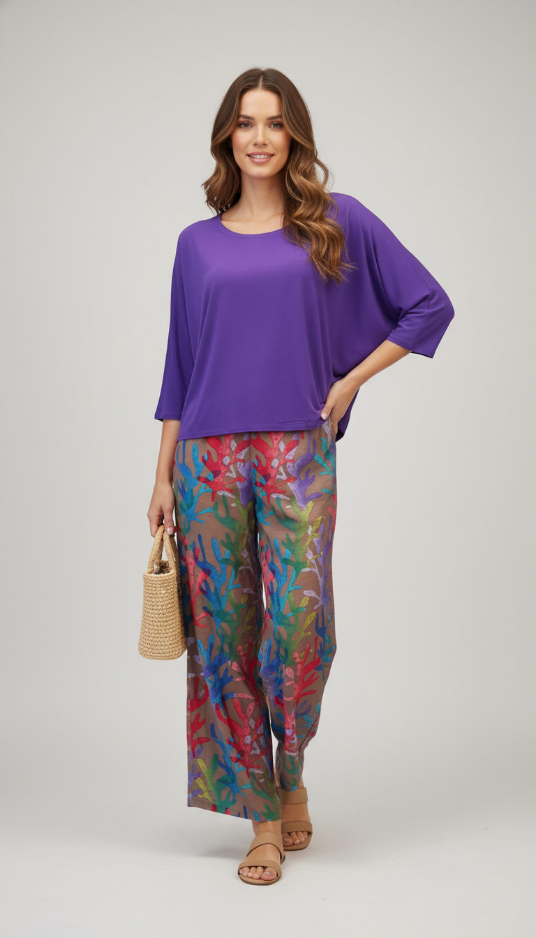Door de vele kleuren in de broek past deze mooi met de vele shirts van Zazou, o.a A-line shirts, shirt Mery, kort of lang met korte mouw.